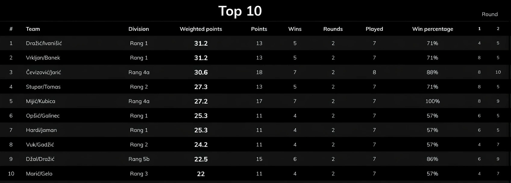 Novi parovi bez ranijih rezultata ulaze u najniži rang.